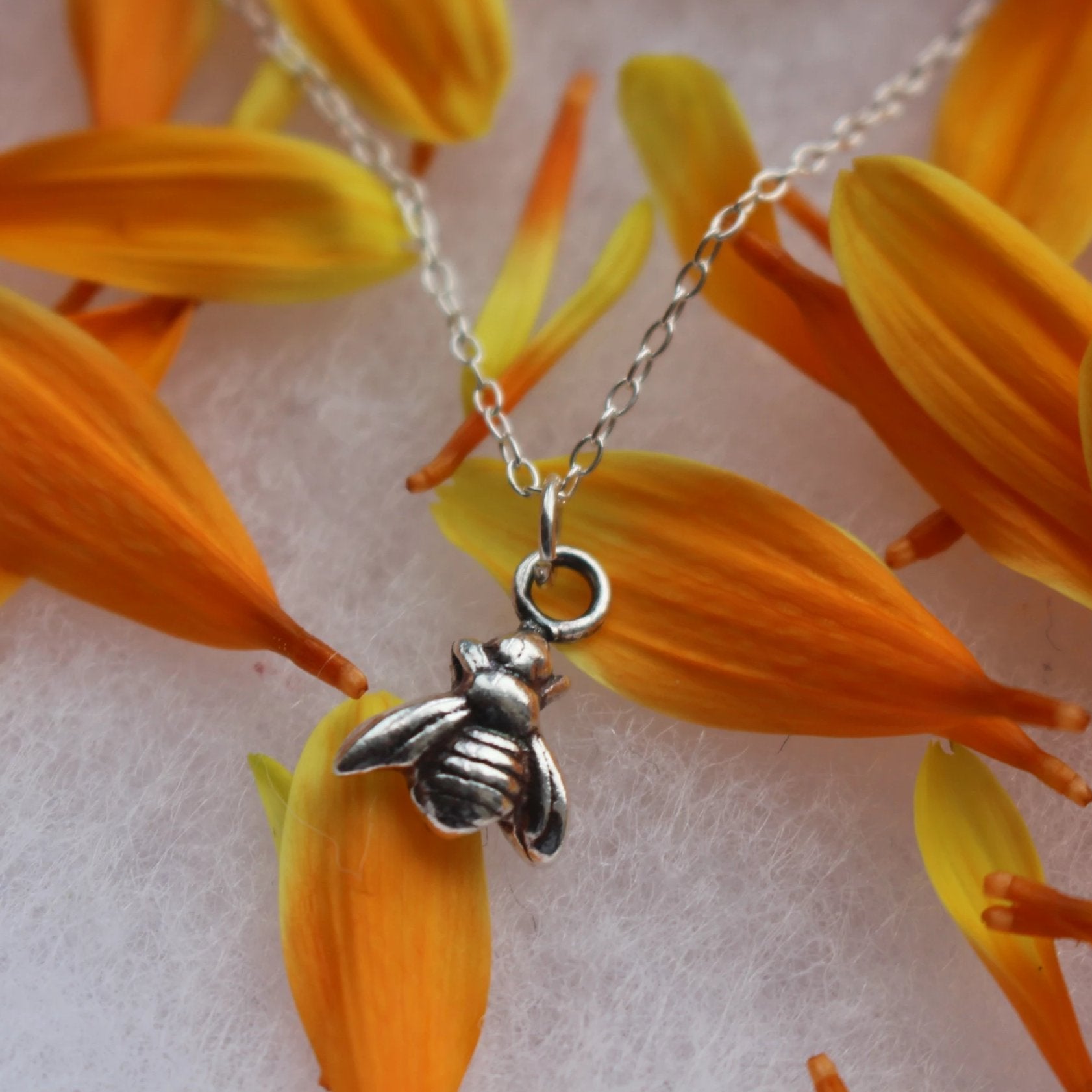 The pendant is made entirely of pure silver, giving it a lustrous, gleaming finish that reflects light beautifully. The bee hangs from a sturdy silver bail, allowing it to move freely on the chain, which is included, and adds a sense of dynamic movement to the piece. The chain itself is elegant and understated, ensuring that the focus remains on the bee. This pendant is both a celebration of nature's beauty and a stylish accessory, perfect for those who appreciate fine craftsmanship and the symbolism of the bee.