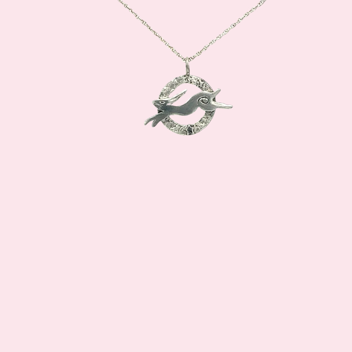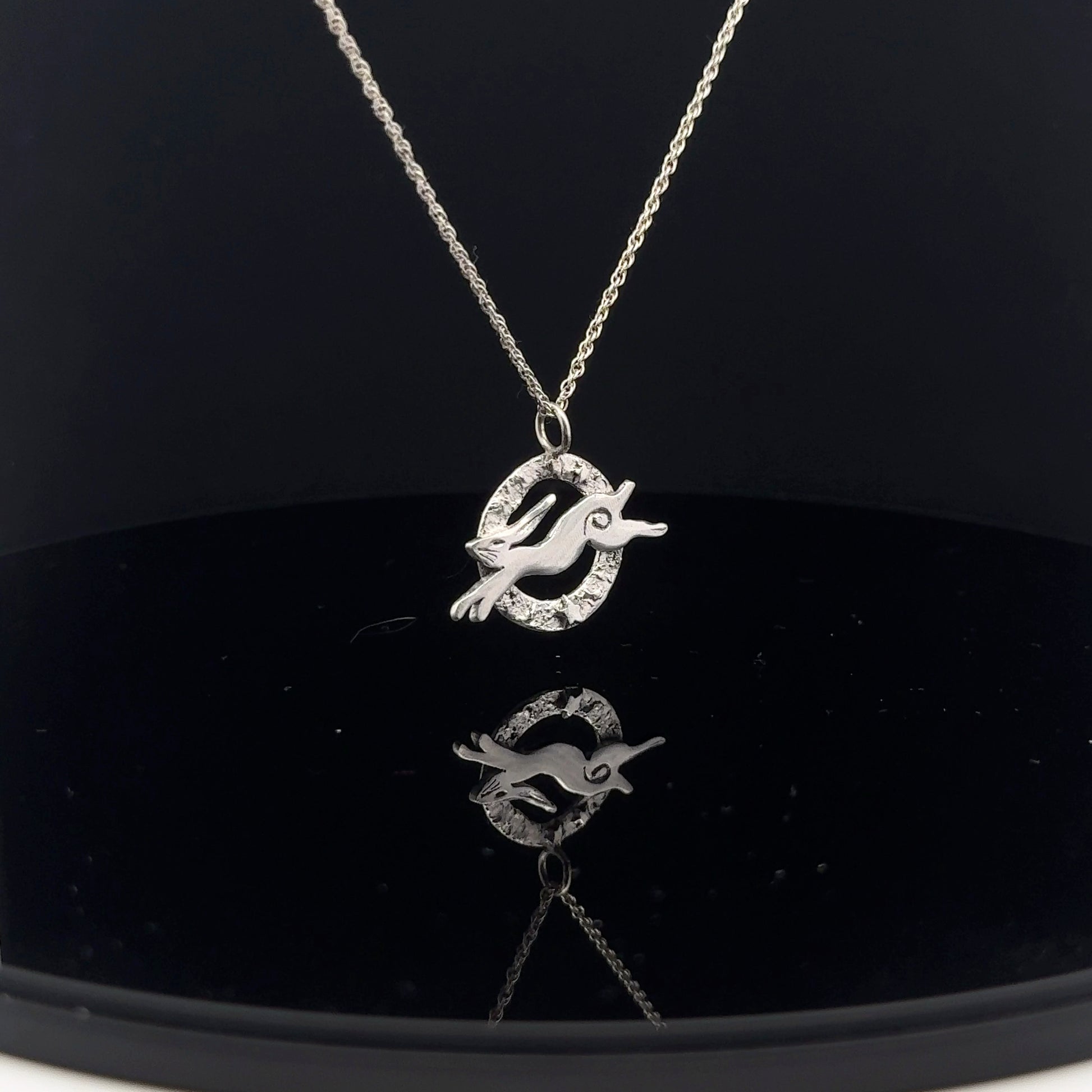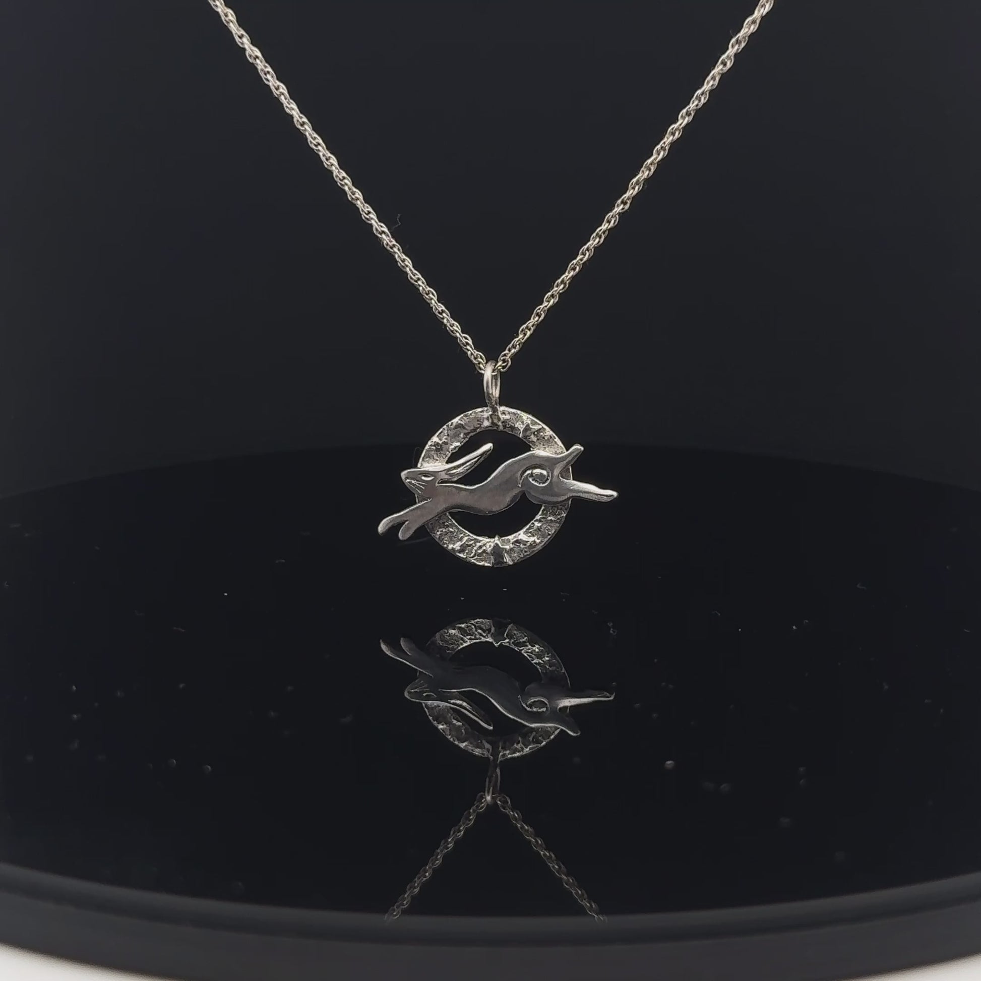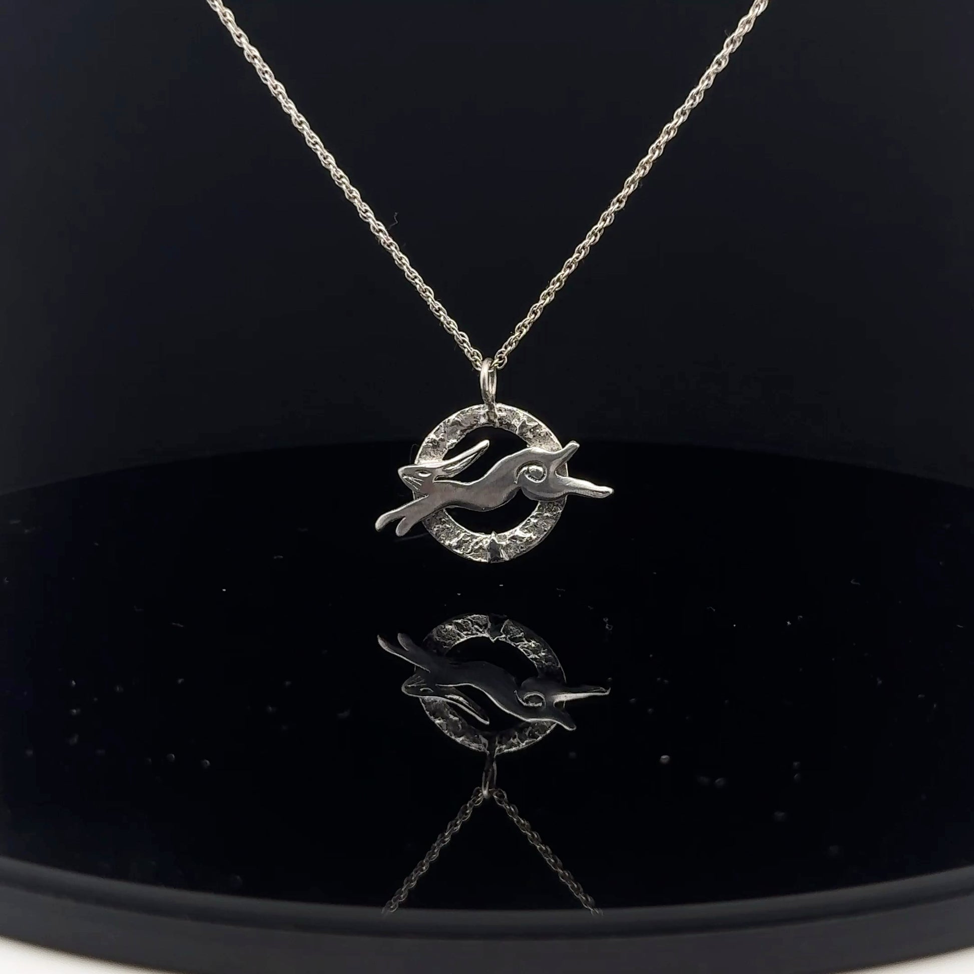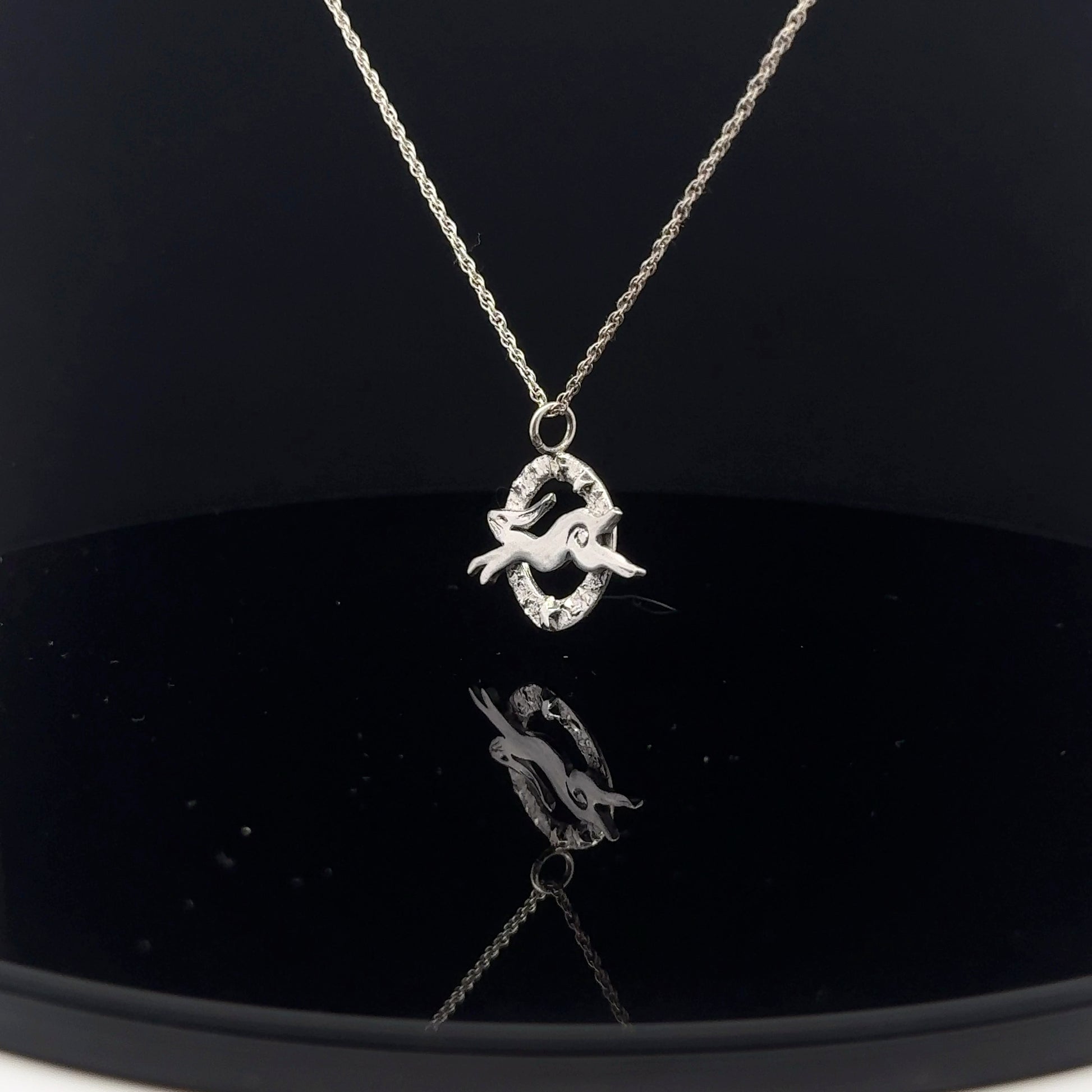 A striking silver pendant capturing the ethereal moment of a hare leaping across the moon. This piece combines celestial symbolism with wildlife artistry, featuring meticulous detailing that brings movement and grace to the design. The hare's silhouette contrasts beautifully against the moon's surface, creating visual depth and narrative intrigue.