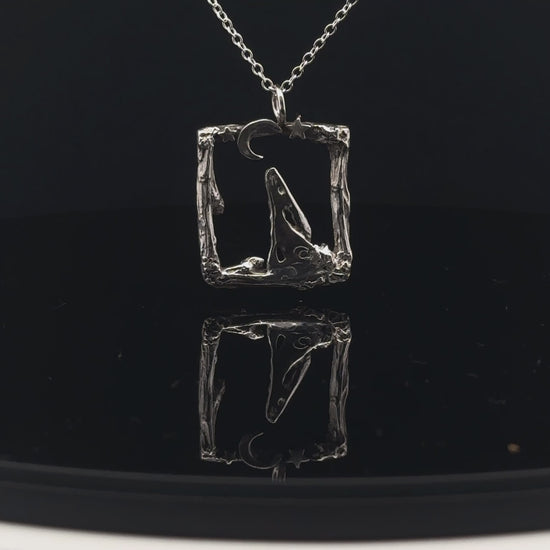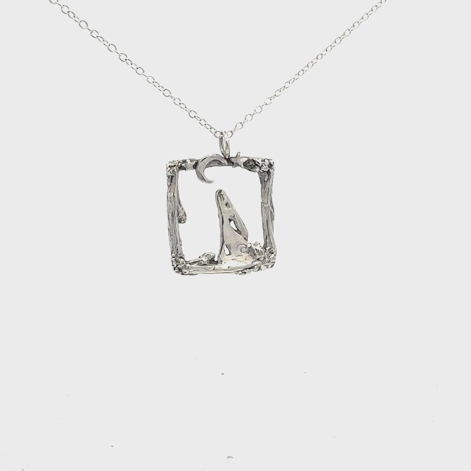 A sophisticated pendant capturing a contemplative hare gazing skyward, nestled within an intricately crafted rustic rectangular setting. This refined piece combines naturalistic detail with artisanal metalwork, creating a distinctive accessory that celebrates the quiet beauty of nocturnal wildlife.