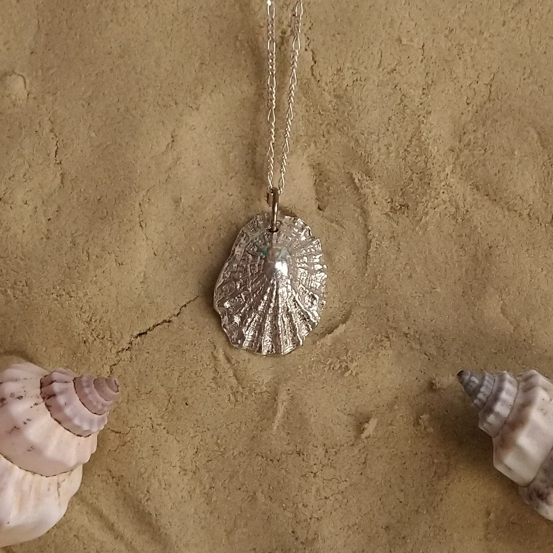 A beautiful silver necklace made from a real shell. Handmade in Market Bosworth with the help of the sea in Cornwall. The approximate dimension of this piece is 1.2cm width and 1.2cm length.