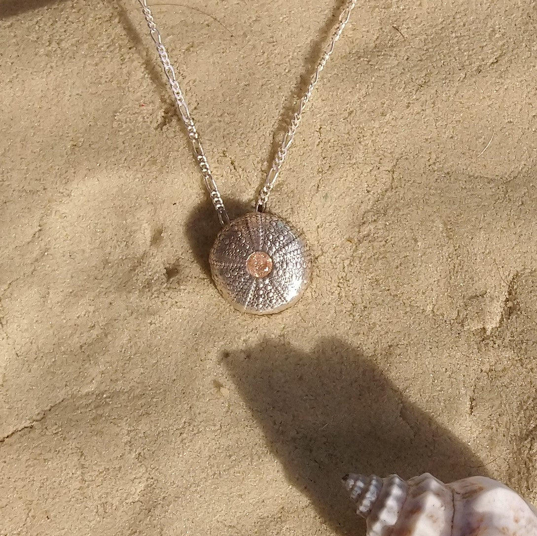 A stunning silver sea urchin necklace made from the cast of a real sea urchin shell. The approximate dimension of this piece is 2cm width and 2cm length.