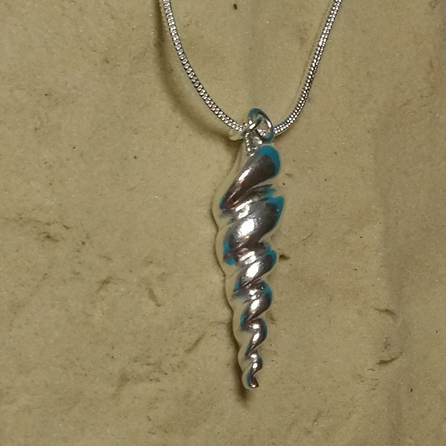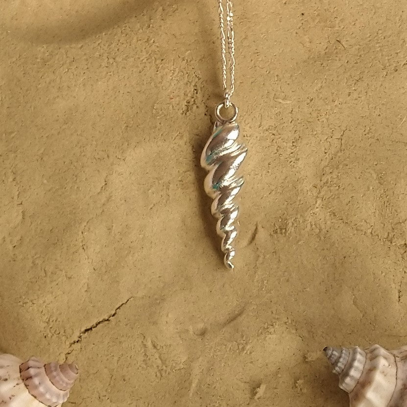 The shell pendant is made from silver clay, which when finished becomes pure solid silver, which accentuates the delicate ridges and contours of the spiral.