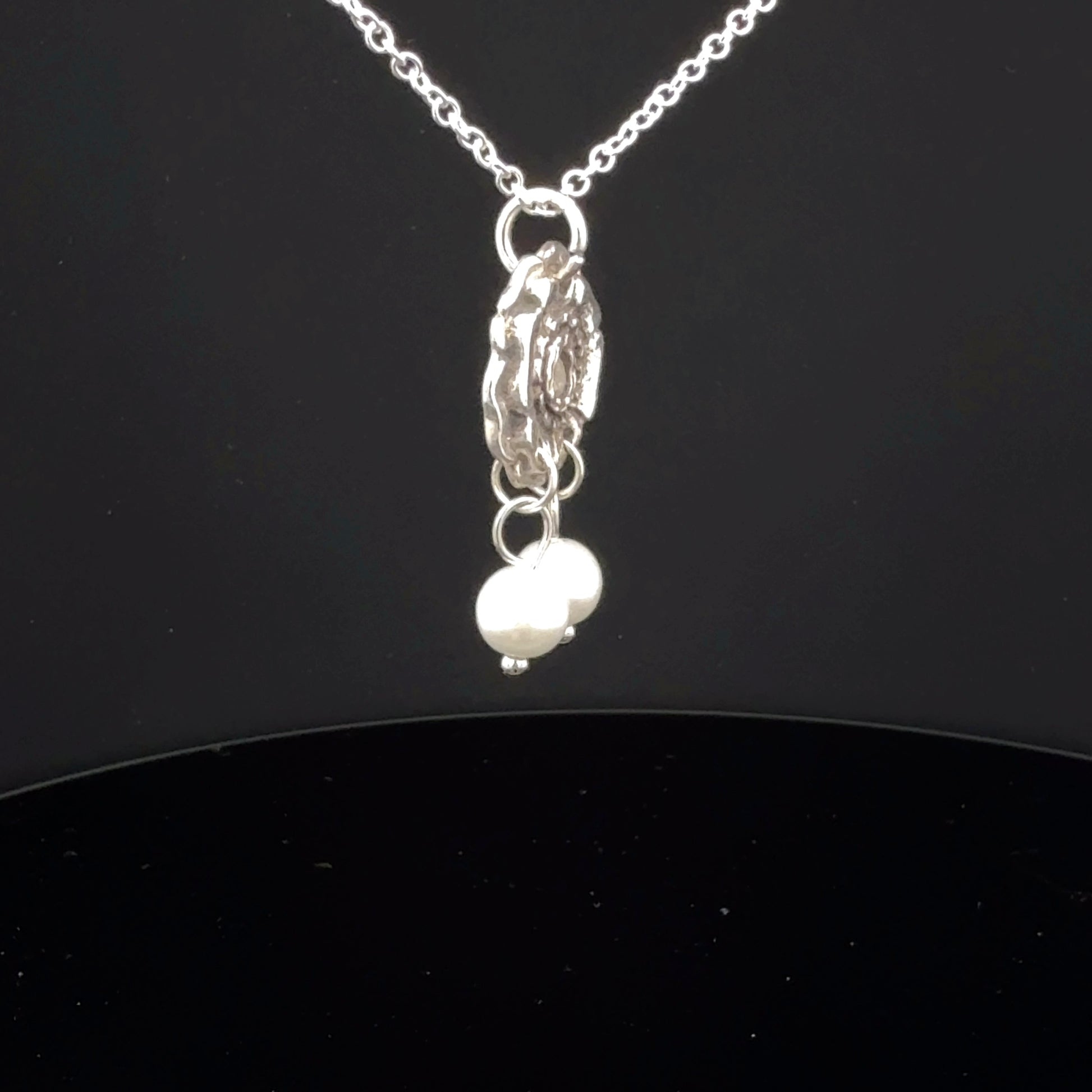 Elevate your style with this exquisite silver chain rose necklace, artfully designed with a central floral motif pendant. Two lustrous, round cabochon-cut pearls delicately dangle, adding a touch of ethereal elegance. A perfect fusion of classic charm and subtle sophistication.