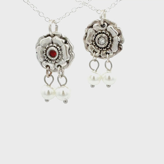 Elevate your style with this exquisite silver chain rose necklace, artfully designed with a central floral motif pendant. Two lustrous, round cabochon-cut pearls delicately dangle, adding a touch of ethereal elegance. A perfect fusion of classic charm and subtle sophistication.