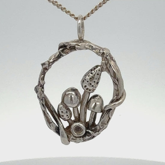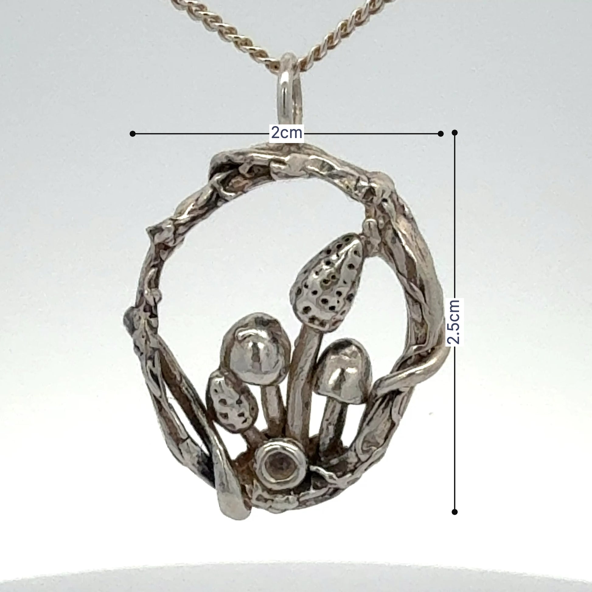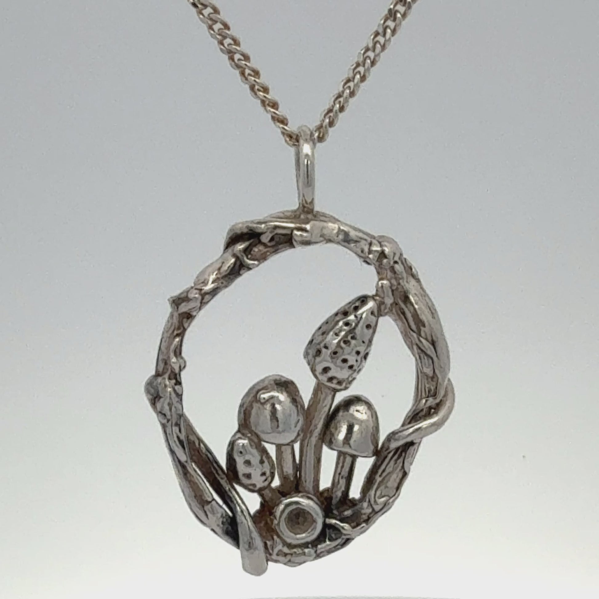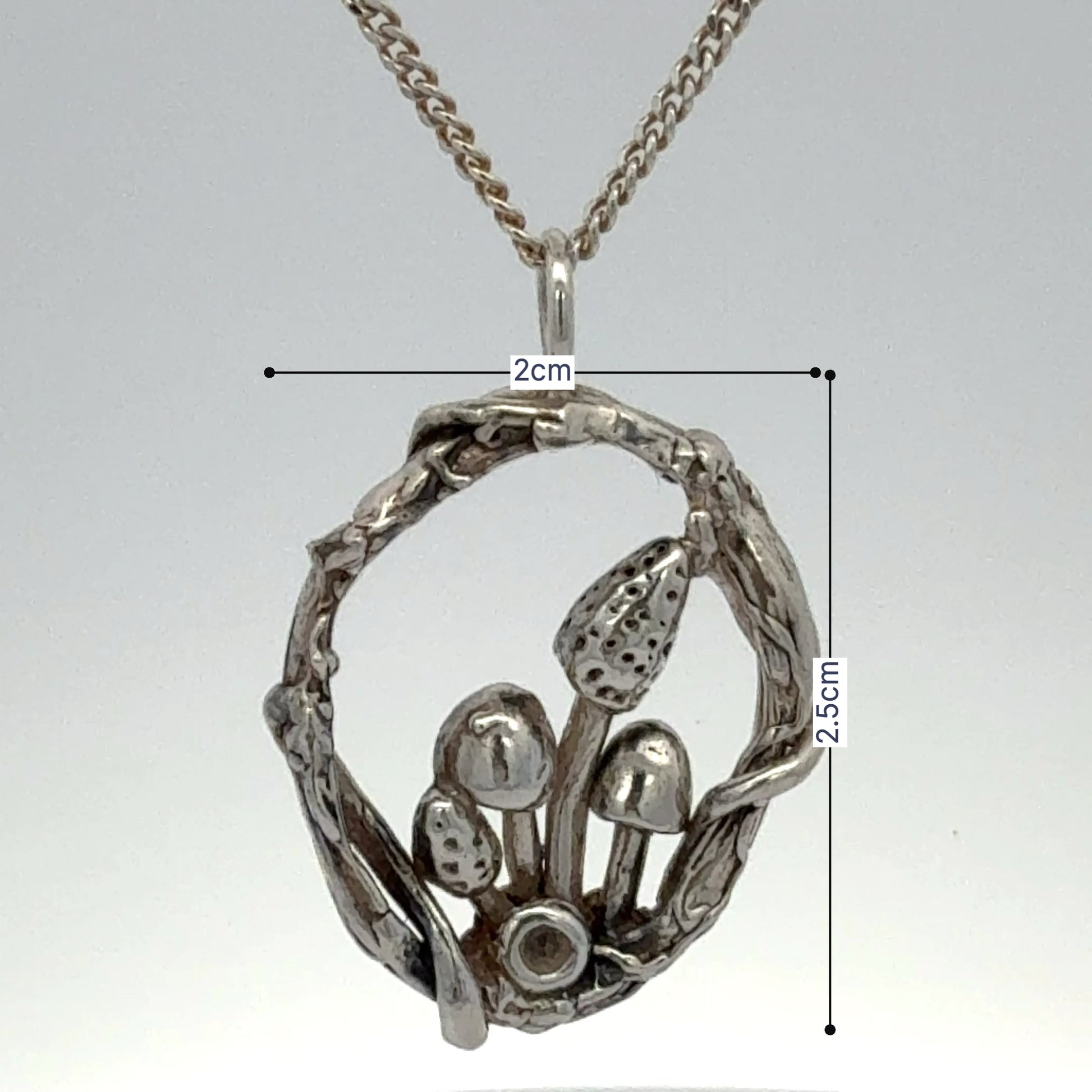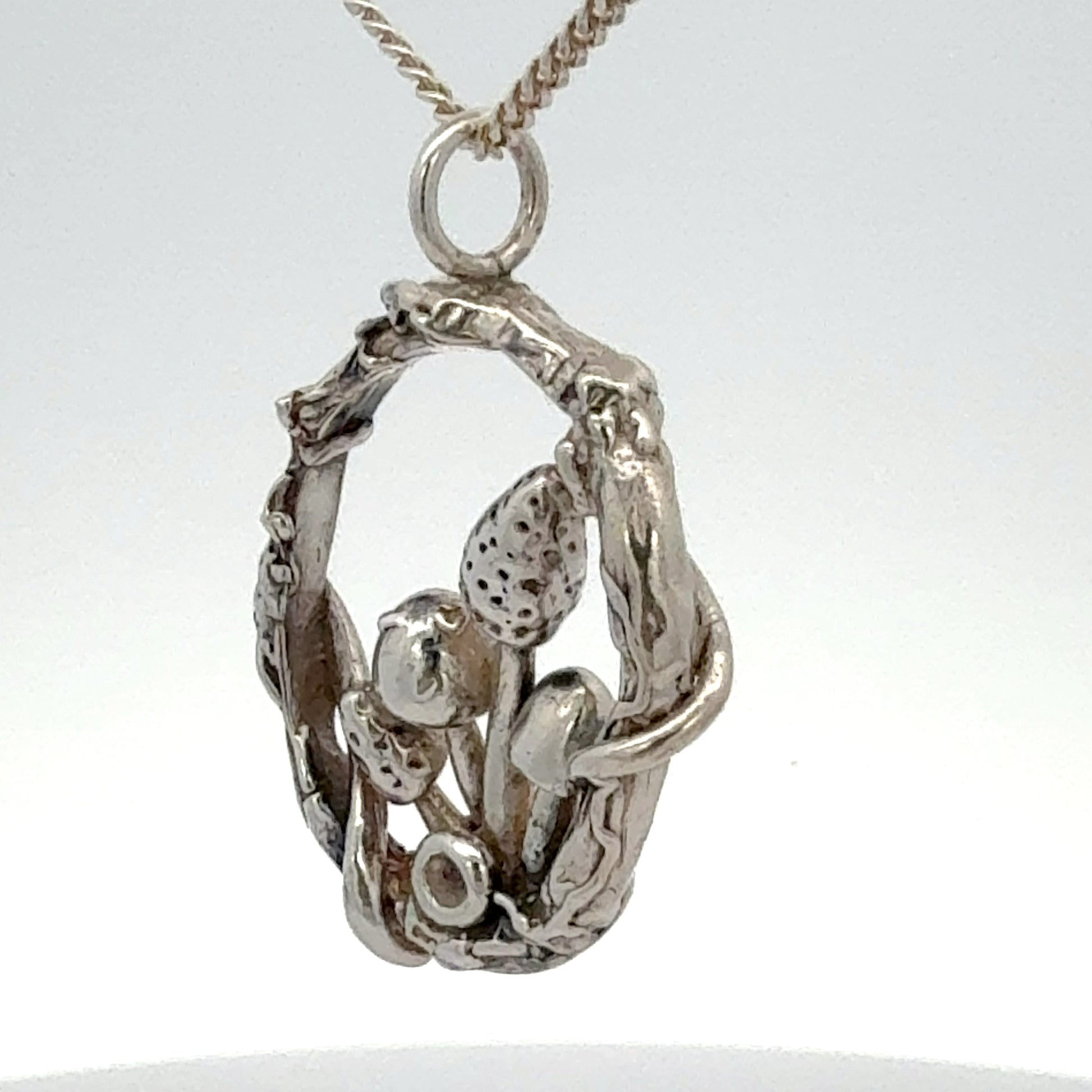 This charming pendant brings woodland nature close to you. It features mushrooms and toadstools in a beautifully detailed rustic oval silver frame. The charm is handmade and 99.9% pure silver. A chain is included.